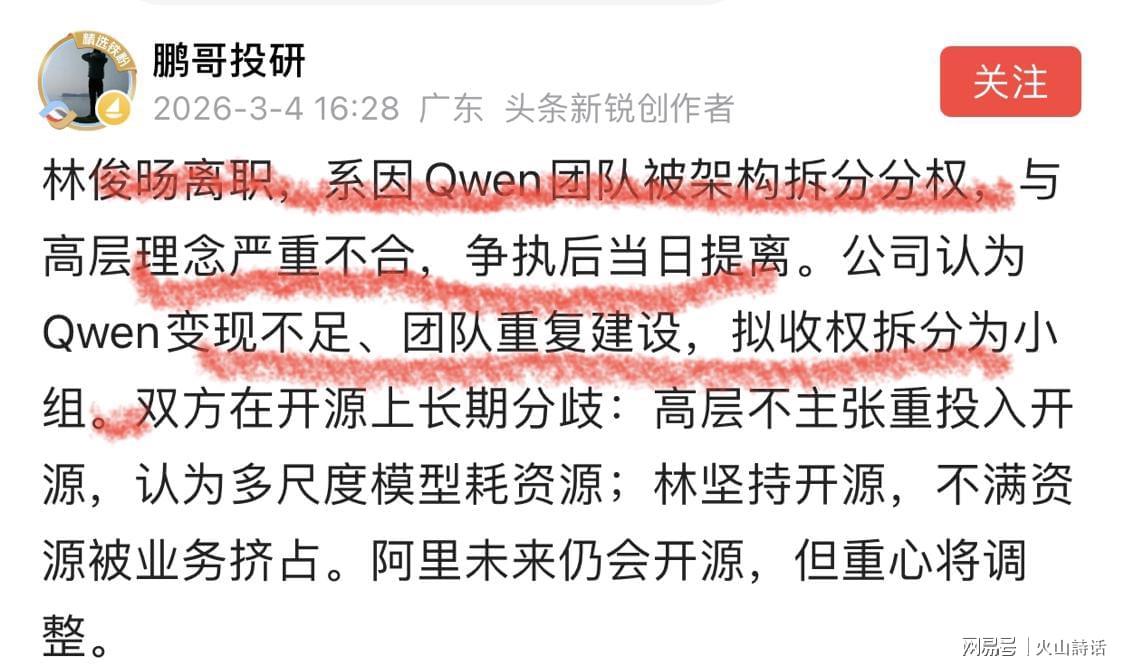 很快有网友爆料,林俊旸离职,系因Qwen团队被架构拆分分权,与高层理念严重不合,争执后当日提离。公司认为Qwen变现不足、团队重复建设,拟收权拆分为小组。双方在开源上长期分歧:高层不主张重投入开源,认为多尺度模型耗资源;林坚持开源,不满资源被业务挤占。阿里未来仍会开源,但重心将调整。