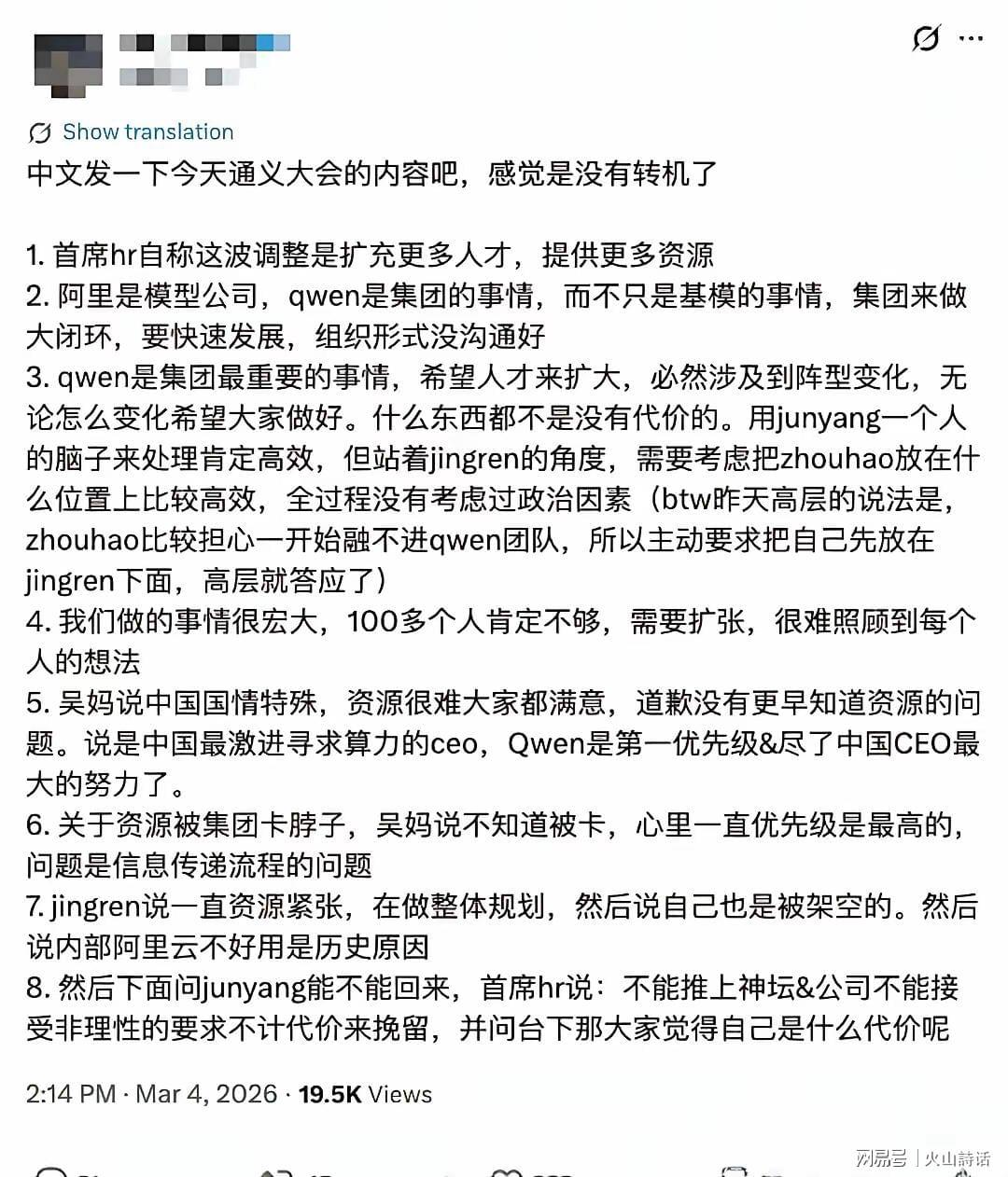 很快,通义紧急开全员会:吴泳铭、蒋芳、周靖人表态流出。据AI圈人士透露,通义当天下午举办了全员大会,高管解答疑问,但总体感觉是没有转机了(林俊旸不会留下来了)。