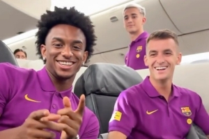 巴萨启程前往日本,开启亚洲行,俱乐部社媒晒出球员们在飞机内的视频,亚马尔喝果汁+刷手机,霍安-加西亚、阿劳霍、拉菲尼亚等多位球员玩游戏,气氛轻松欢乐。